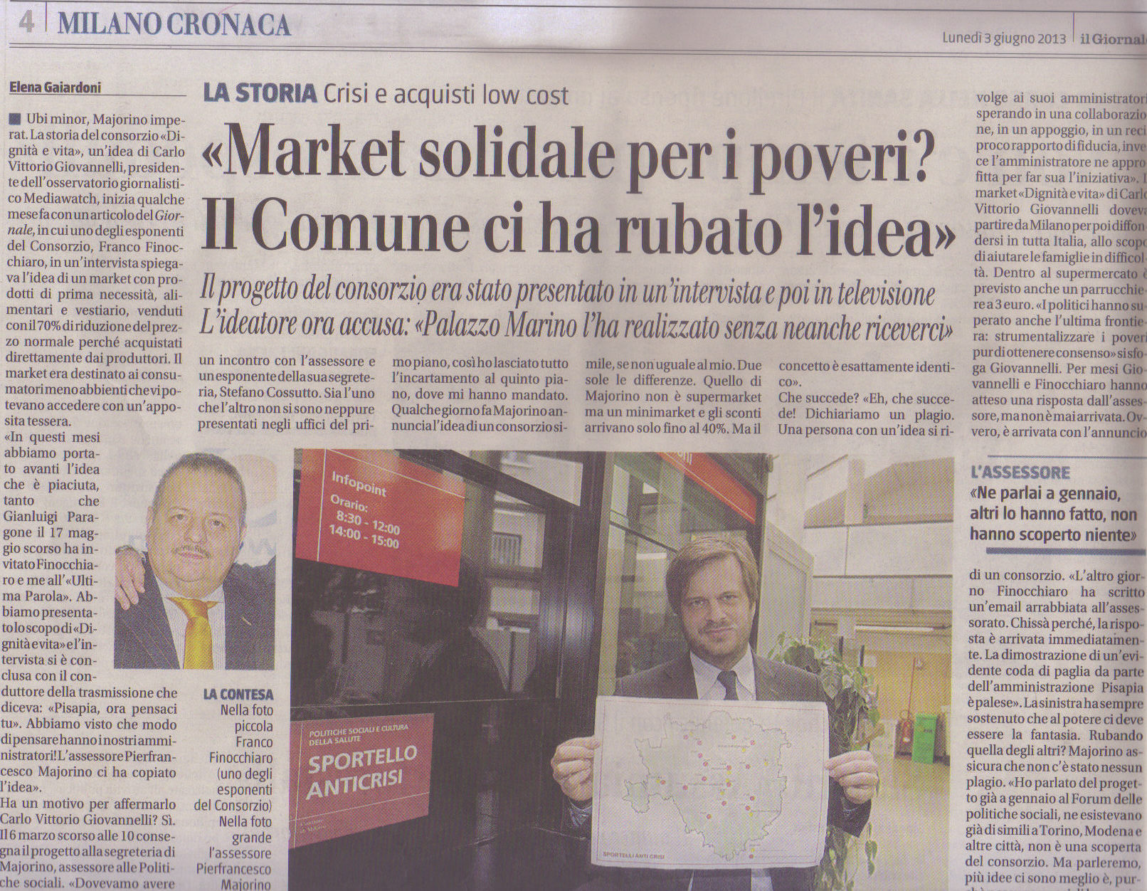 Ubi minor, Majorino imperat. La storia del consorzio «Dignità e vita», un’idea di Carlo Vittorio Giovannelli, presidente dell’osservatorio giornalistico Mediawatch, inizia qualche mese fa con un articolo del Giornale, in cui uno degli esponenti del Consorzio, Franco Finocchiaro, in un’intervista spiegava l’idea di un market con prodotti di prima necessità, alimentari e vestiario, venduti con il 70% di riduzione del prezzo normale perché acquistati direttamente dai produttori.