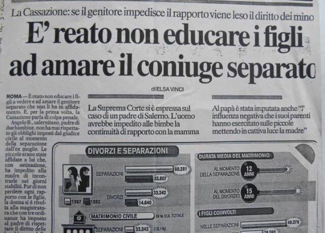 ROMA – è reato non educare i figli a vedere e ad amare il genitore separato che non li ha in affidamento. E, per la prima volta, la Cassazione parla di colpa penale. Angelo B., salernitano, padre di due bambine, non ha mai rispettato gli obblighi imposti dal giudice civile al momento della separazione dall’ ex moglie. Le piccole erano state affidate a lui che, con ostinazione, ha impedito alla madre di incontrarle nei giorni stabiliti. Pur di non perdere ogni rapporto con le figlie, la donna si è rivolta alla magistratura che con tre ordinanze ha imposto al padre di rispettare il diritto delle bambine e della mamma di incontrarsi. Ma Angelo B. non ne ha tenuto conto. Per questo è stato condannato in primo e secondo grado a 18 mesi di carcere. La Suprema Corte ha confermato il diritto della madre di contribuire all’ educazione, alla crescita psicologica delle bimbe. Ha ribadito che la disobbedienza del padre alle ordinanze dei giudici è reato penale, il 388 del codice, per la prima volta esteso al comportamento del genitore affidatario che non “collabora” alla realizzazione del diritto di visita ai figli dell’ ex coniuge. “è di intuitiva evidenza – scrivono i “cassazionisti” – il ruolo centrale che assume il genitore affidatario nel favorire gli incontri dei figli minori con l’ altro genitore, a prescindere dall’ osservanza burocratica degli obblighi imposti dai giudici”. Inoltre, “l’ atteggiamento omissivo finisce col riflettersi negativamente sulla psicologia dei minori, indotti così a contrastare essi stessi gli incontri con la madre perché non sensibilizzati ed educati al rapporto con essa”. Non soltanto. La Corte rimprovera ad Angelo B. “l’ influenza negativa che i suoi parenti hanno esercitato sulle bambine mettendo in cattiva luce la loro mamma”. “Un evento – ammonisce la Cassazione – che l’ uomo avrebbe dovuto evitare”. Il processo tornerà alla corte d’ Appello di Salerno per un maggiore approfondimento delle motivazioni che sorreggono la condanna, senza però cancellare “la colpevolezza dell’ imputato”. Per i supremi giudici la pena potrà essere modificata “ma non eliminata”. “Nonostante la separazione – dice Livia Pomodoro, presidente del tribunale dei minori di Milano – si resta entrambi genitori dei propri figli e non si può privarli di un diritto”. E Ernesto Caffo, fondatore di Telefono azzurro, afferma: “Per il bambino è importantissimo avere il padre e la madre come punti di riferimento anche se sono separati. Ne ha bisogno per costruire la sue certezze, il suo senso di sicurezza”. Parla di sentenza “storica” il sottosegretario Maretta Scoca. “Occorre l’ affidamento congiunto”, insiste l’ associazione Crescere Insieme, che da tre legislature si batte perché il Parlamento riveda le norme sull’ affidamento dei figli dei separati per aumentare la possibilità di contatti regolari e significativi con entrambi i genitori.